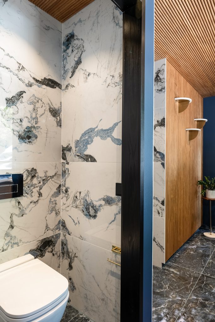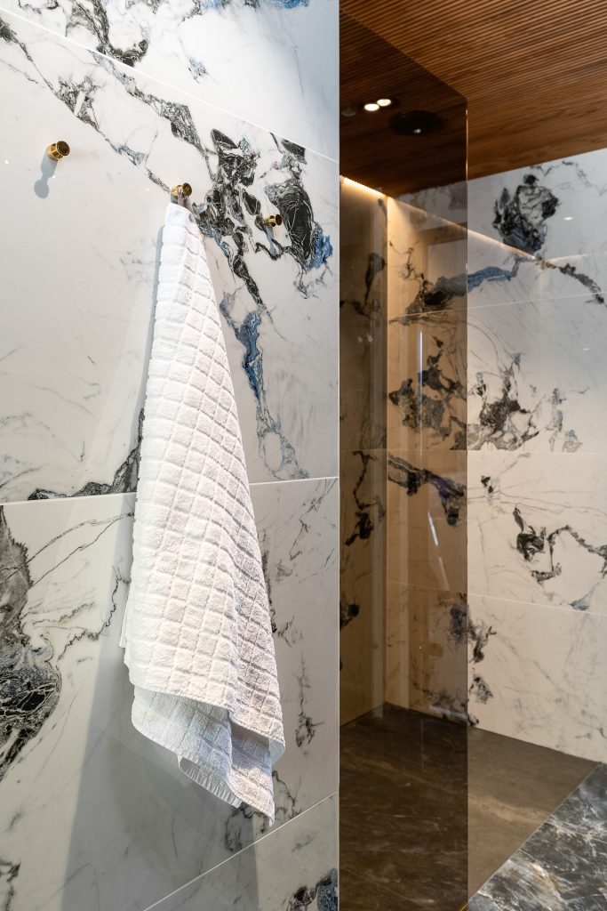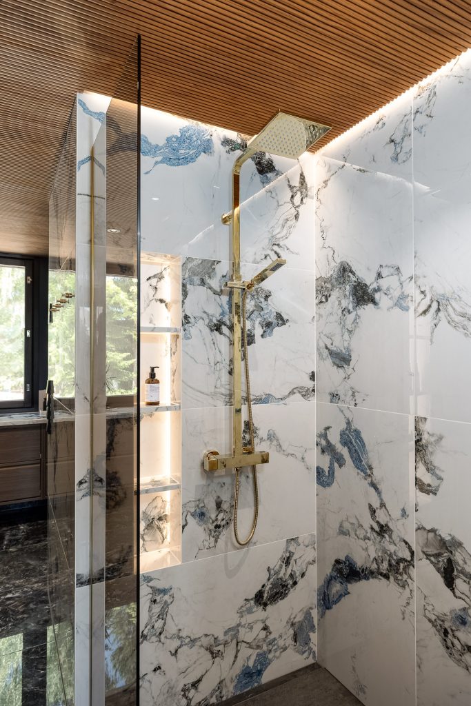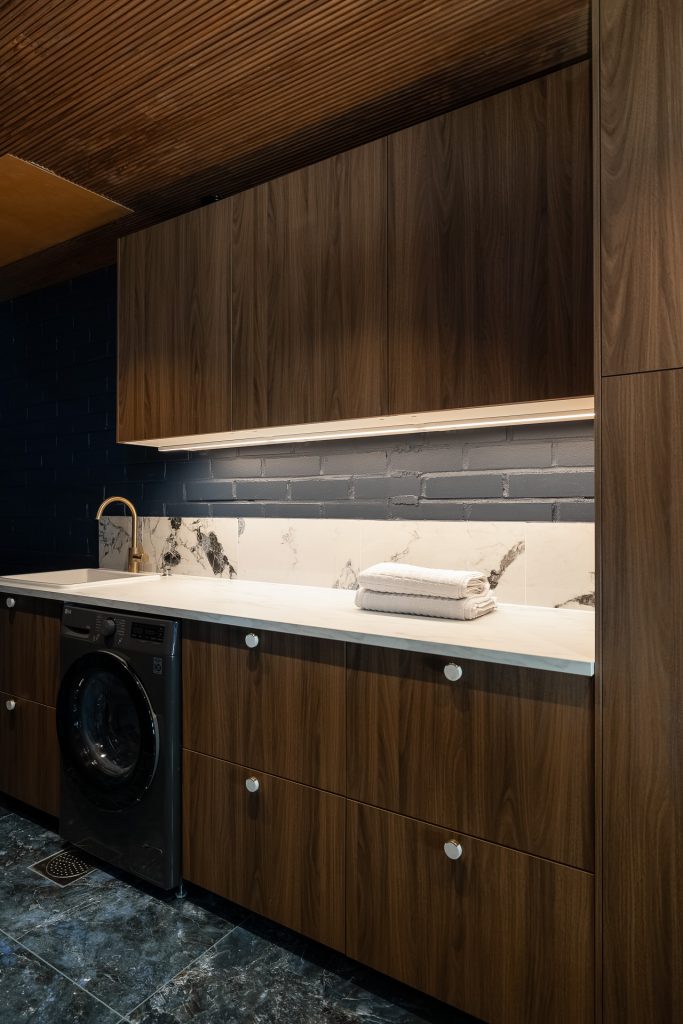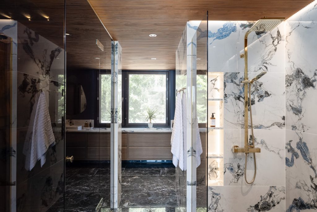 Asiakas hoiti itse kohteen purun, jonka jälkeen suunniteltiin pesuhuone, sauna ja wc-tila kokonaan uudelleen. Vaatehuone ja kodinhoitohuone niin ikään pysyi vanhoilla paikoillaan.