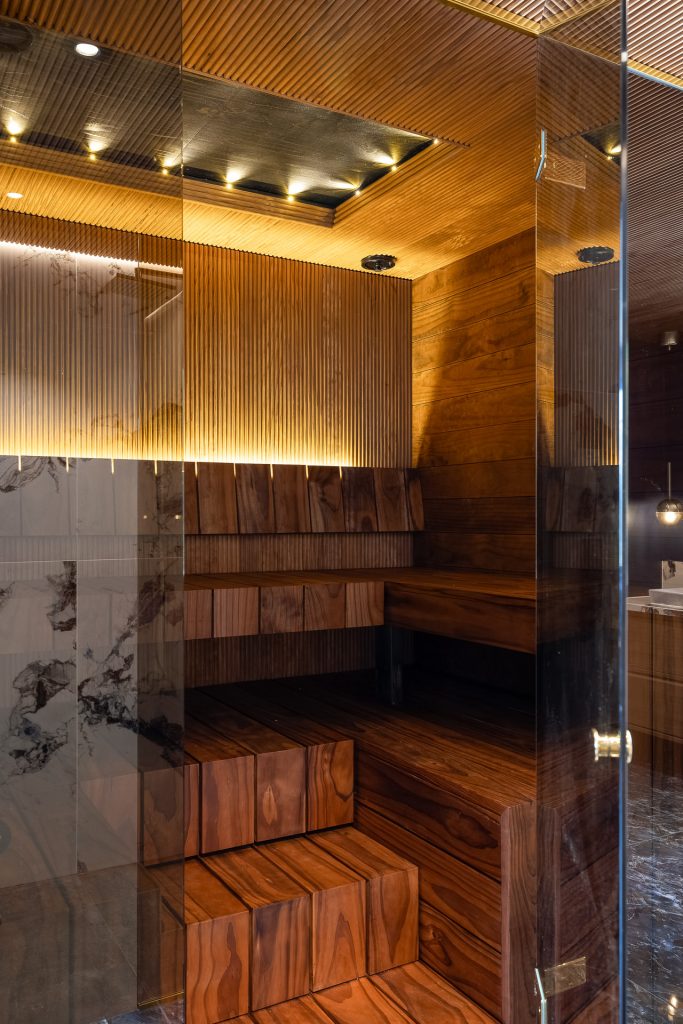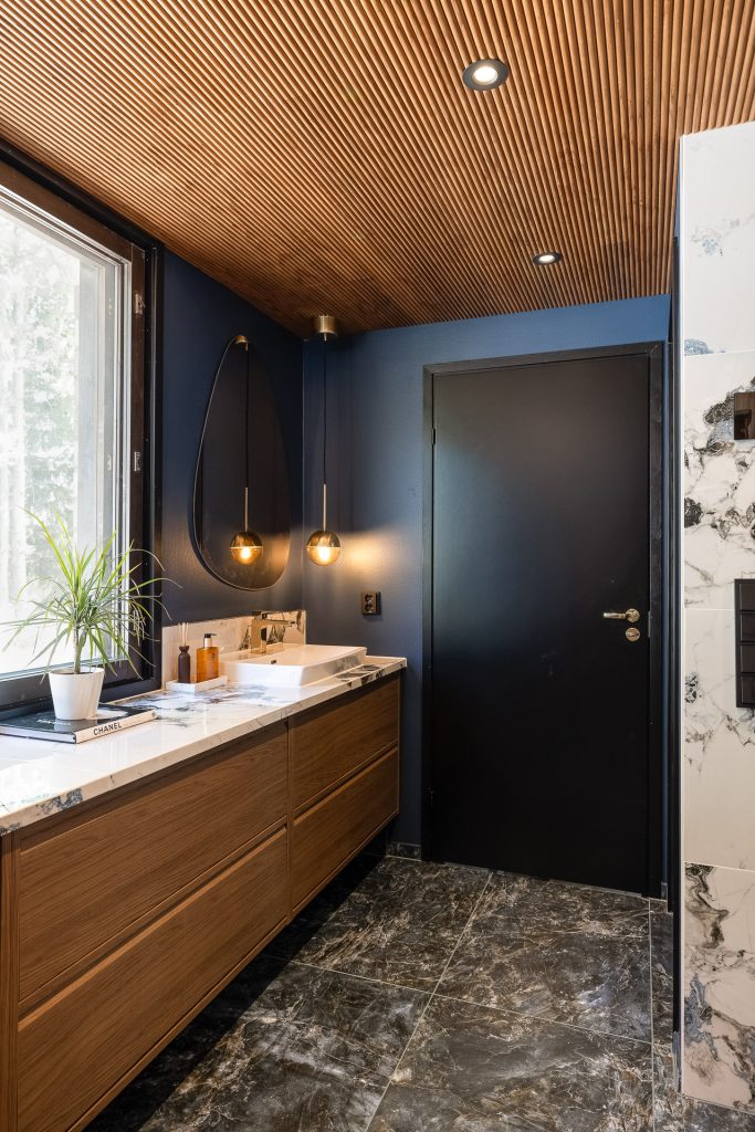 Valaistuksessa käytettiin led spot kohdevaloja, joiden lisänä pesuhuoneessa ja saunassa on epäsuoraa valoa.