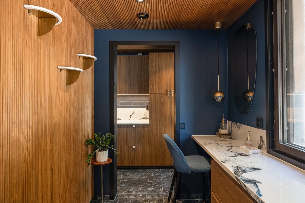 Vaatehuoneen työtaso tehtiin samasta seinälaatasta kuin kylpyhuoneen seinät.